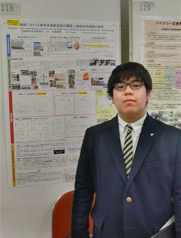 今回の研究は「海面における表面波実験装置の構築と漣痕形成過程の考察」として、海の砂浜に残る波の痕跡「漣痕」が塩分によって間隔が左右されるという、地質学の読み解きには極めて重大な自然現象の傾向の発見となりました。この1年、松島湾での波打ち際の観察を利府町の沿岸の地域の皆さまに毎月の船での活動でご協力を頂きつつ、実験室で何百回と実験を繰り返し、データの精査や実験精度の向上が審査員はじめ諸先生方に大きく評価をされたものです。