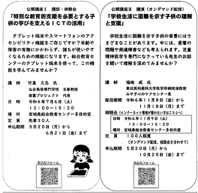 | ①特別支援教育効果講座 | ②りんくるみやぎ 電話相談・巡回相談会のお知らせ |