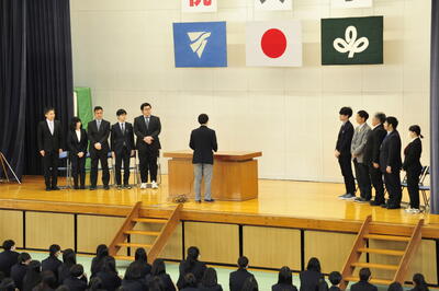 新生徒会会長を中心とした生徒会役員・総合運動部長・総合文化部長の引き継ぎ式を